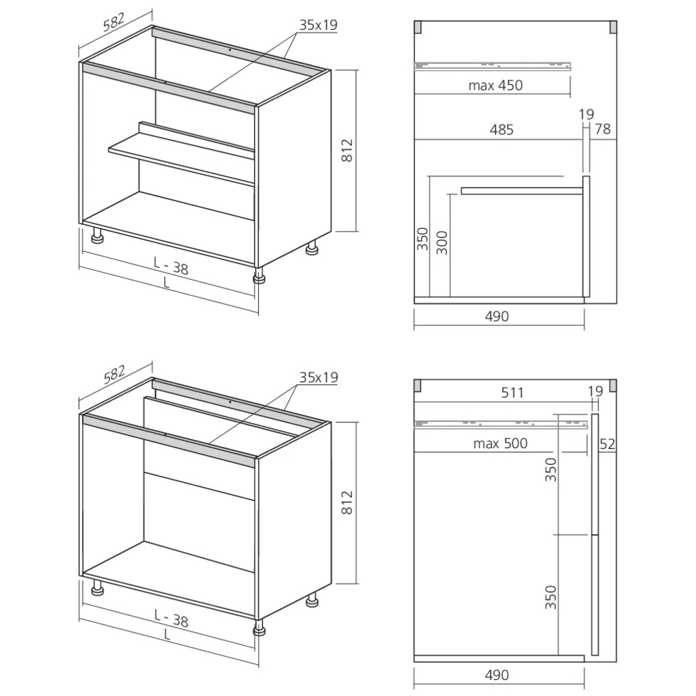 Kastdiepte binnenwerks: 465 mm inclusief achterwand, 518 mm exclusief achterwand